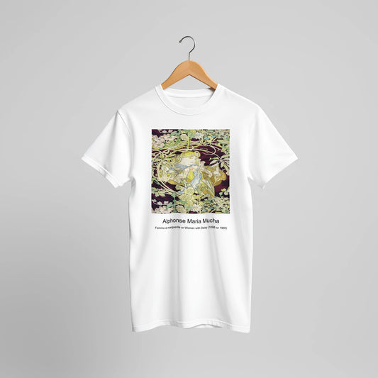 Femme à marguerite or Woman with Daisy (1898 or 1900) by Alphonse Maria Mucha. Custom Print on a 100% Airlume Combed and Ring-Spun Cotton Unisex Crewneck T-shirt Optimised Aspect Ratio.