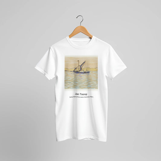 Sailing boats off the coast of Domburg (1907) by Jan Toorop. Custom Print on a 100% Airlume Combed and Ring-Spun Cotton Unisex Crewneck T-shirt Optimised Aspect Ratio.
