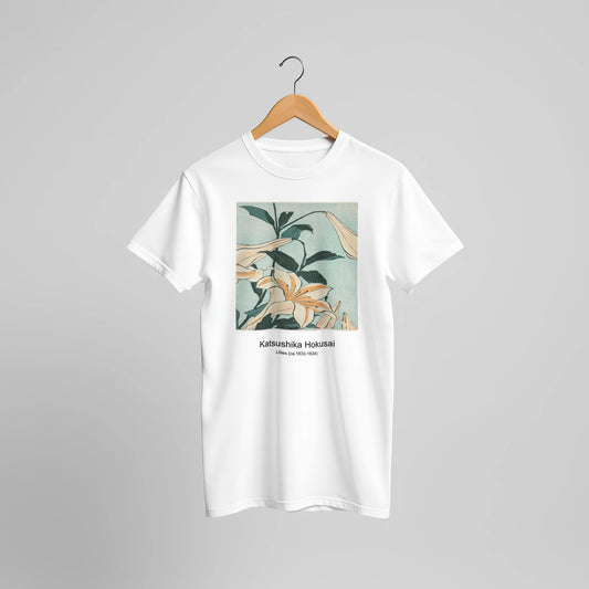 Lilies (ca. 1833-1834) by Katsushika Hokusai. Custom Print on a 100% Airlume Combed and Ring-Spun Cotton Unisex Crewneck T-shirt Optimised Aspect Ratio.