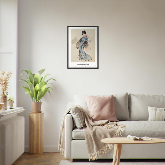 Woman, Full-Length Portrait, Standing, Facing Left, Holding Fan in Right Hand, Wearing Kimono with Check Design (1805) by Katsushika Hokusai. Archival Print on Museum Quality Matte Paper. Premium Wood Framed Wall Art. Original Aspect Ratio