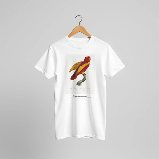 Red-and-Gold Lory, Lorius rex from Natural History of Parrots (1801-1805) by Francois Levaillant. Custom Print on a 100% Airlume Combed and Ring-Spun Cotton Unisex Crewneck T-shirt Optimised Aspect Ratio.